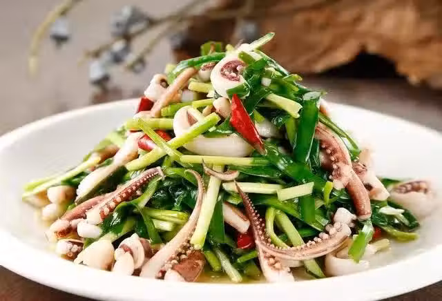 3.鍋內放油,下魷魚須大火翻炒,加醬油,精鹽,少量味精,料酒,十三香粉等煸炒