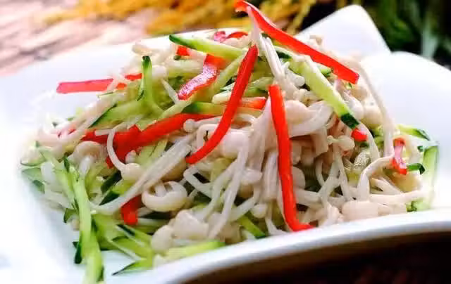 用料:金針菇1把、黃瓜(根)1個、紅椒1個、醋1勺、蔥適量、蒜半個、水1大杯、橄欖油1勺、白糖少許、辣椒醬適量