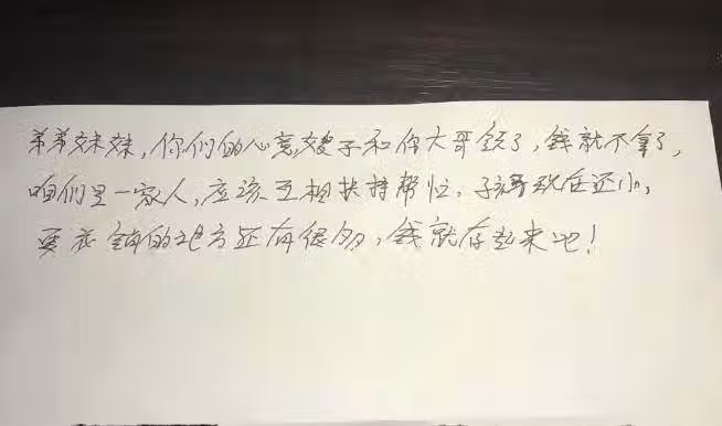 婆婆拉著莉莉和大兒媳婦的手高興地流下了眼淚,一家人在三年以後終於團聚了。一個月後莉莉夫妻要回去上班了,嫂子把孩子的衣服收拾後放進了袋子裡,再三囑咐他們孩子的生活習慣,要照顧好孩子。回到家後莉莉把孩子安頓好後就去收拾孩子的衣服,準備給女兒沖奶粉,打開奶粉蓋時,頓時傻了眼,裡面放著她給嫂子的銀行卡和一張紙條,紙條上面寫著:弟弟妹妹,你們的心意嫂子和你大哥領了,錢就不拿了,咱們是一家人,應該互相扶持幫忙,孩子現在還小,要花銷的地方還有很多,錢就存起來吧。