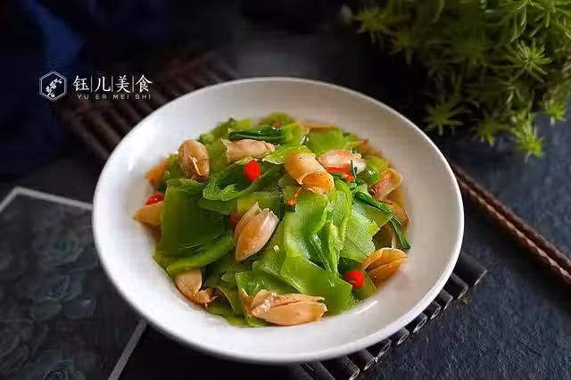 食材:烏賊300克、萵筍300克、青辣椒1個、紅辣椒3個、生薑絲少許、蒜頭2粒、蚝油1勺、鹽1勺、雞精少許