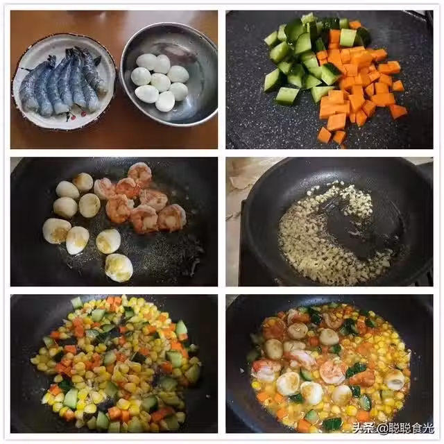 7、鍋里放油,加入蒜末炒出蒜香味。把胡蘿蔔丁、玉米粒和黃瓜丁,放入鍋里炒至胡蘿蔔和黃瓜變軟。放入之前煎好的鵪鶉蛋和蝦仁。