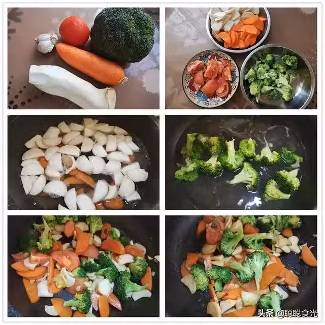 3、鍋里倒油,放入蒜末爆香,接著把杏鮑菇和胡蘿蔔片放入鍋里炒一下,再放入西藍花,翻炒1分鐘左右。