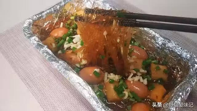 4.接著開始煮粉絲,在錫紙盒內加入開水、適量火鍋底料、粉絲、火鍋丸或者海鮮,然後把錫紙盒放在火上開小火,水開後煮5分鐘。