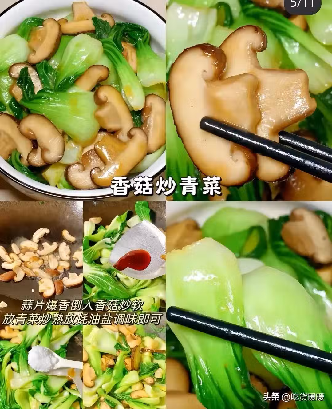 蒜片爆香,倒入香菇炒軟。放青菜炒熟,放蚝油鹽調味即可。
