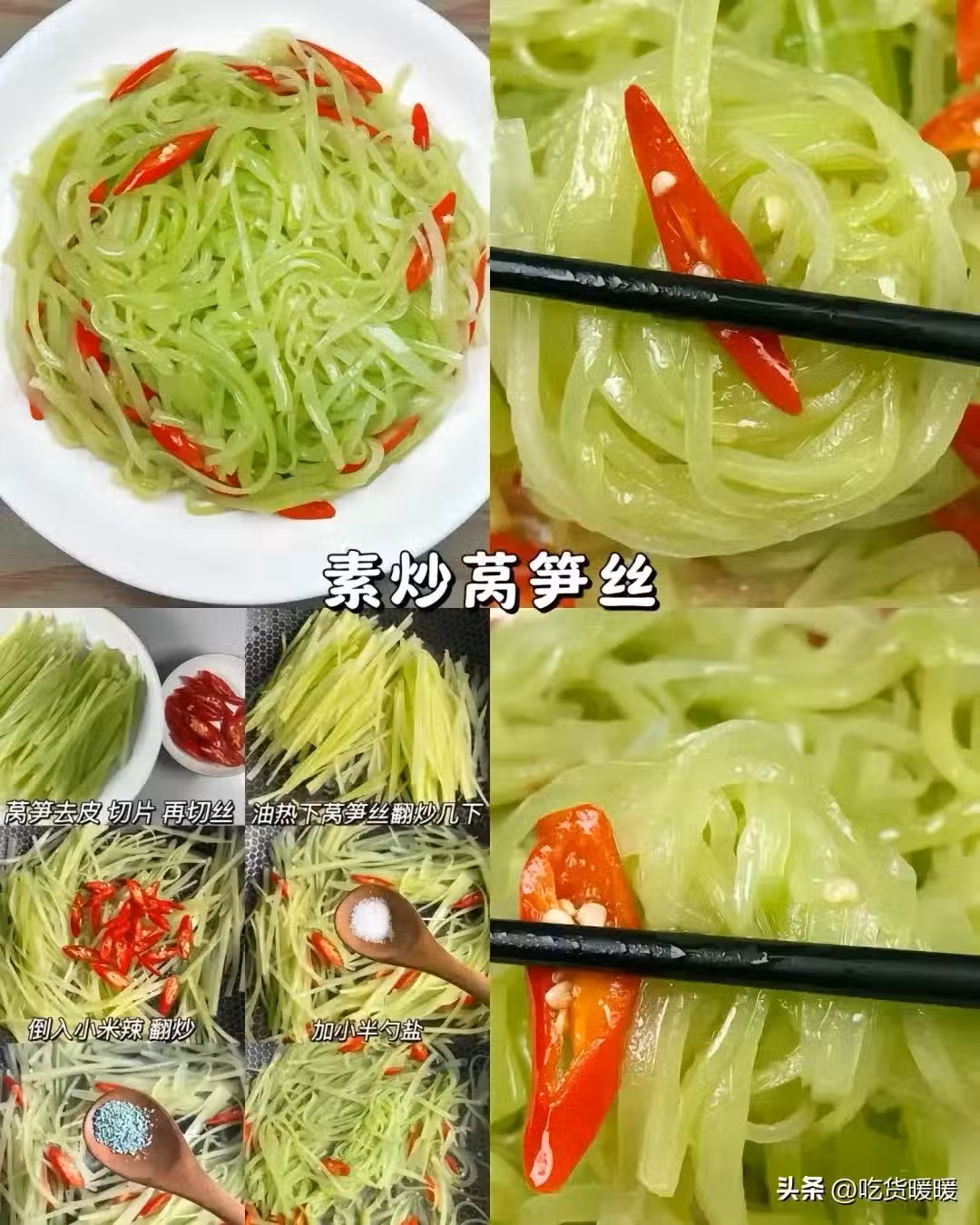 萵筍去皮, 切片 、再切絲,油熱下萵筍絲翻炒幾下,倒入小米辣翻炒 加小半勺鹽 ,半勺雞精。