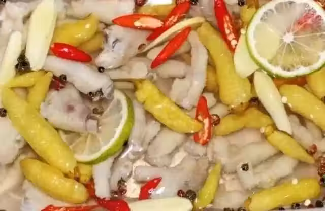 鳳爪500克,泡椒1袋,食鹽1勺,白糖1勺,白醋2勺,白酒3勺,香葉5片,八角2個,桂皮少許,花椒10克,蔥10克,干辣椒6個,根姜10克。蒜10克