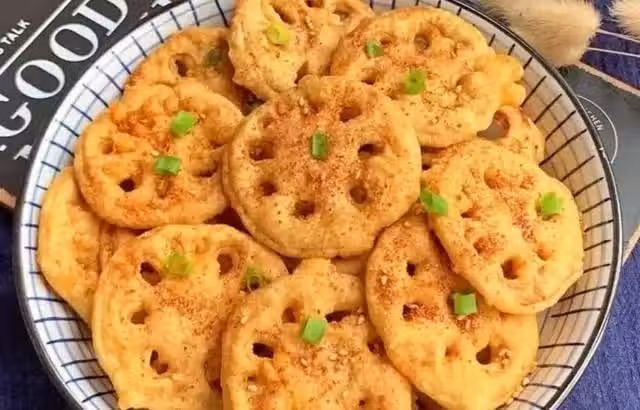 2、熱鍋放油至七成熱,依次放入蓮藕中小火炸至金黃撈出,繼續燒油溫八成熱,復炸一遍馬上撈出,撒上椒鹽粉,辣椒粉就可以吃了。