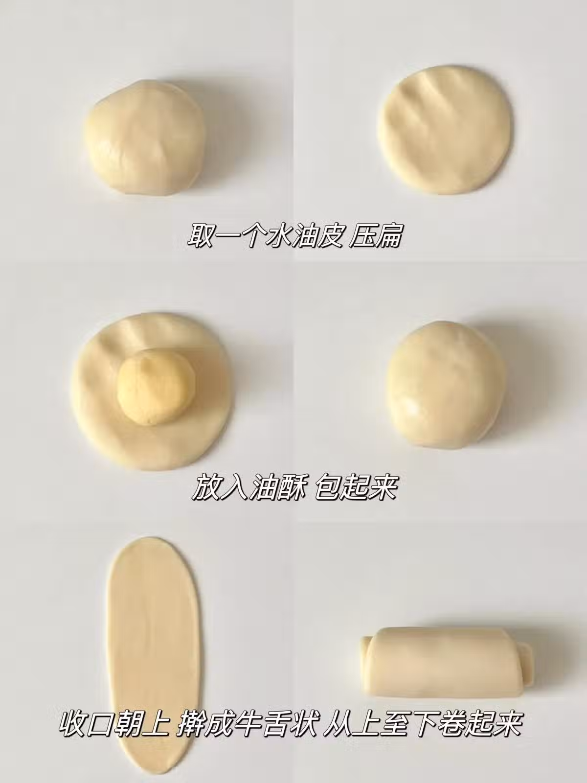 4️⃣將卷擀長,捲起來,用手指在中間壓一下兩邊合起來,壓扁,擀開,放入餡料包起來(這一步建議案板上鋪一層保鮮膜,不容易飛皮)