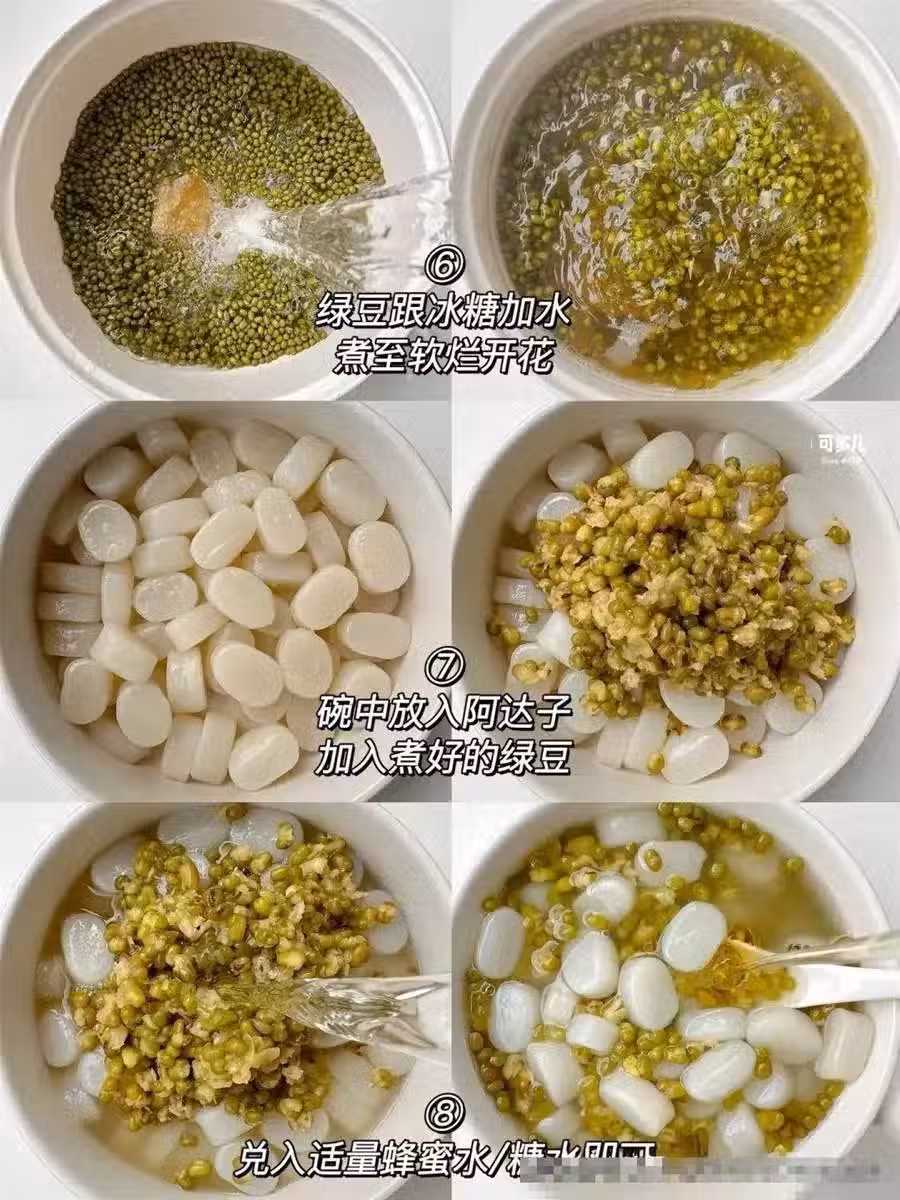 取一個碗,放入煮好的阿達子和綠豆,兌入適量的蜂蜜水或糖水即可享用。