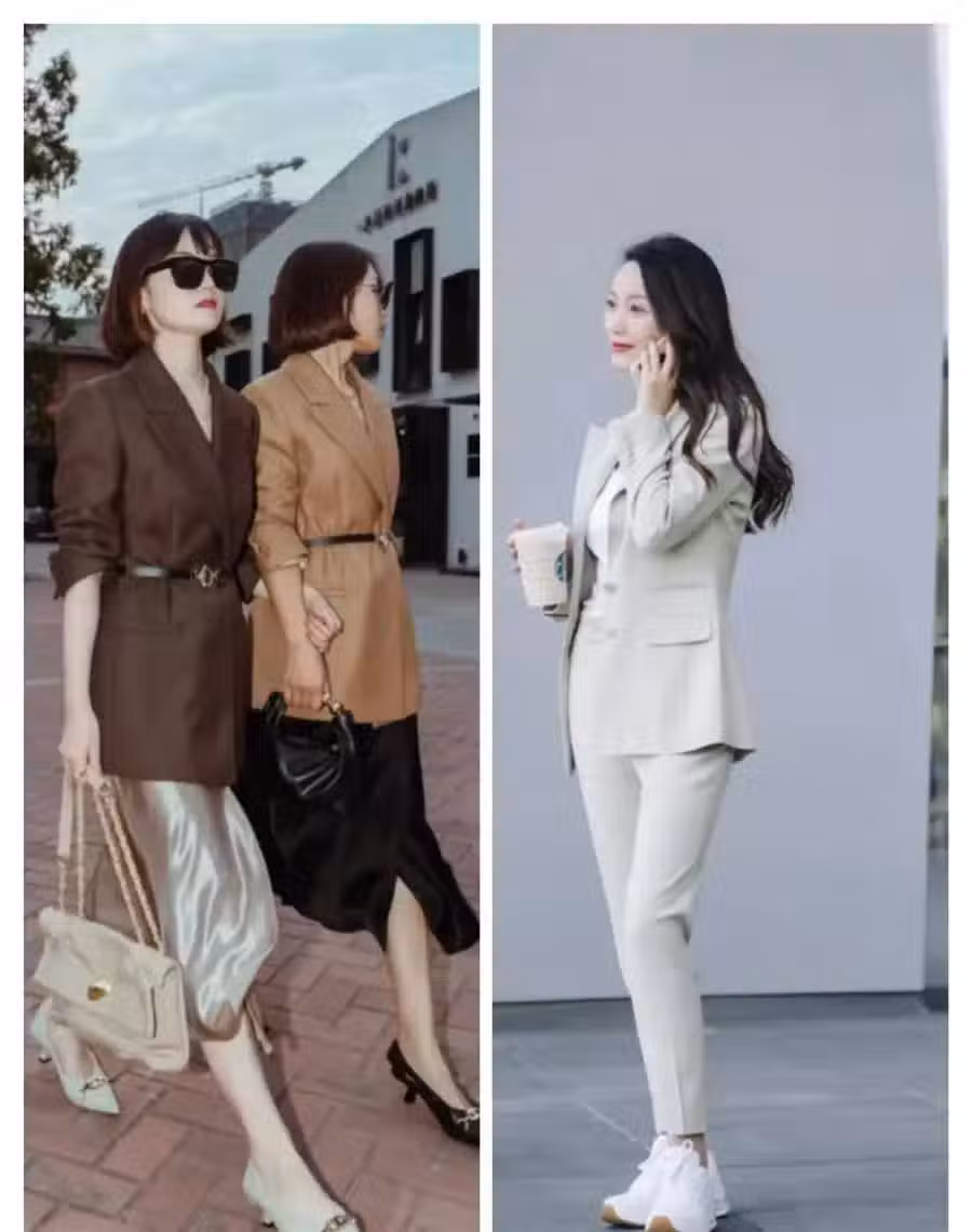 如果是在職場通勤當中的搭配,不同的鞋型組合是會將整體的氣質呈現大相逕庭的,利落幹練的樂福鞋搭配就是高級得體的職場女性的優選,而搭配的運動鞋則就略顯休閒和降低氣場了。