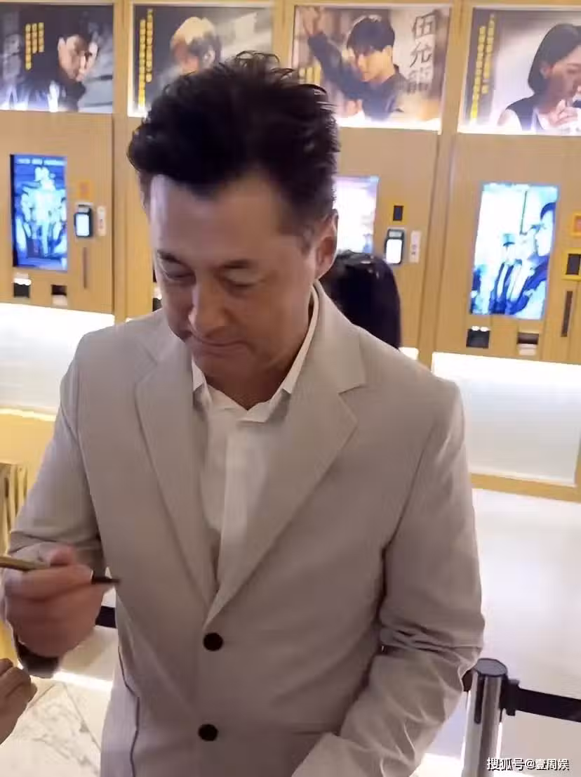 從畫面中可見王敏德西裝革履出現在影院門口,一身白馬王子的打扮,看起來非常的紳士,雖然兩鬢有點泛白,但頭髮還是很濃密,並沒有禿頂掉發,身材也一如既往的保持得不錯,雖然不見得有腹肌,但整個人看起來精神抖擻。