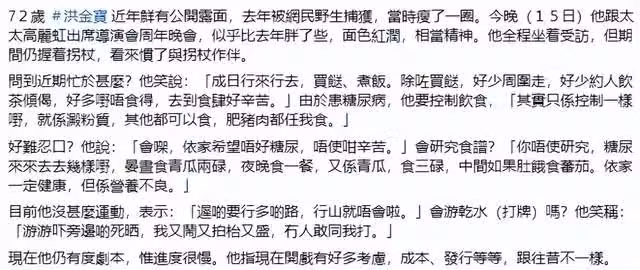 75歲洪金寶近況曝光,大腹便便胸口有水漬,患糖尿病行動不便