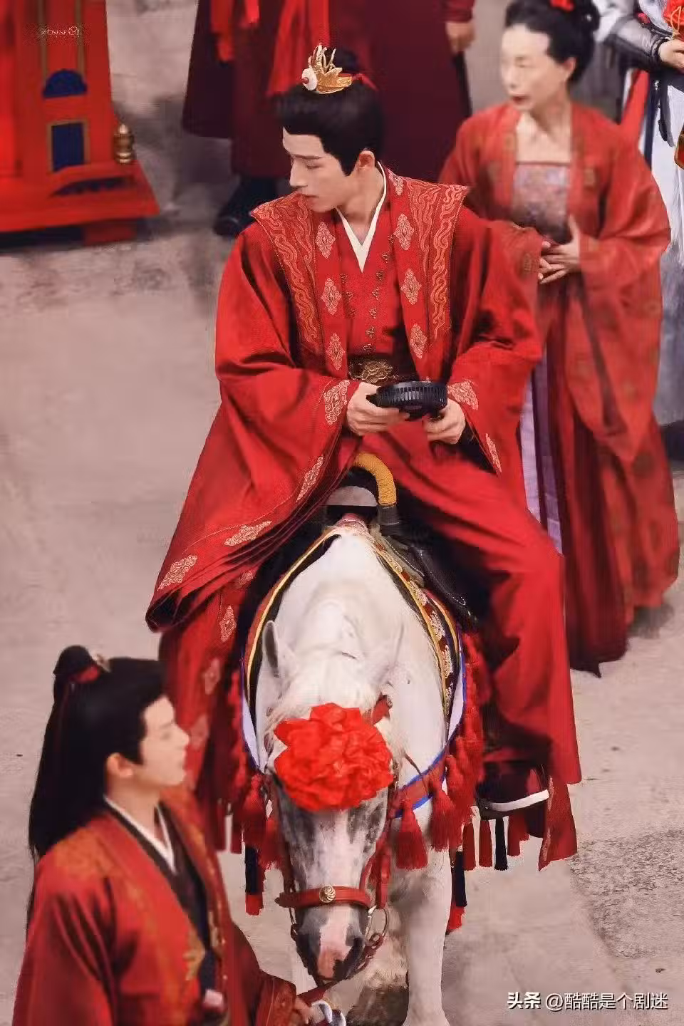 而在定風波裡面,還有一場戲是大婚的造型,鏡頭裡,他穿上紅色的衣服,就連前面的馬也是頭戴大紅花,非常搶鏡。