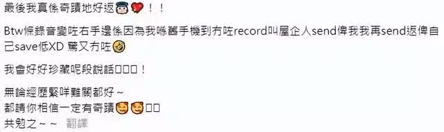 該名網民透露得到鍾嘉欣鼓勵後非常感動,病況慢慢有所好轉:「最後我真的奇蹟地康復了!Btw這條錄音變成右手邊發出來的,是因為我在舊手機那裡沒有了記錄,叫家人發送給我我再發送給自己保存下來的XD,怕又沒有了。