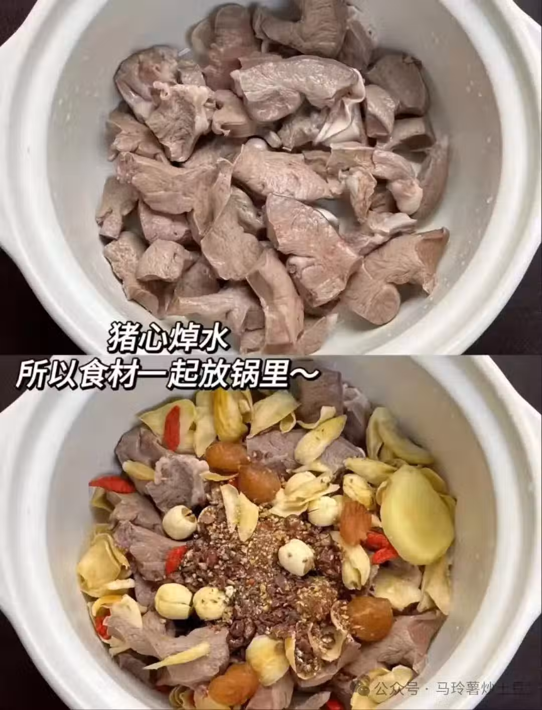 豬心焯水,酸棗仁碾碎,除枸杞外,食材全部放入鍋里