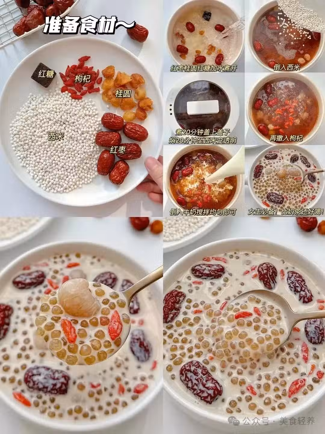 - 食材:紅豆100g、黑米80g、黑芝麻60g、糯米80g、紅糖20g、紅棗5-8個、枸杞適量、牛奶150ml