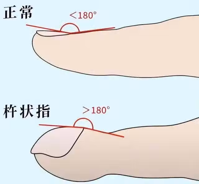 末端組織增生、肥厚,看起來像個小鼓槌,呈杵狀膨大,連指甲也跟著 「變形」,從根部到末端像搭起了一座拱形小橋,變得高高隆起。當肺部出現病變,氣道被堵住,身體組織得不到足夠氧氣,離心臟比較遠的手指末端,就可能出現周圍組織增厚的情況,這就是醫學上說的 「杵狀指」。而且,肺癌患者的杵狀指可能出現得特別早,甚至比其他肺癌症狀先一步登場。