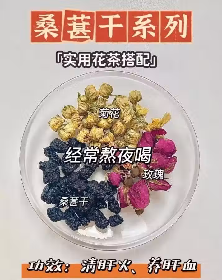 1、桑葚干+玫瑰+菊花(經常熬夜喝)