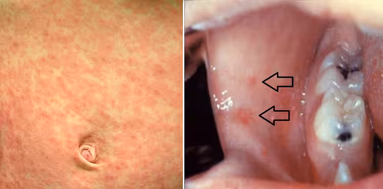 發燒3-4天後,口腔下臼齒對面內頰側黏膜上出現柯氏斑點(Koplik spots),如上方右圖箭頭處。
