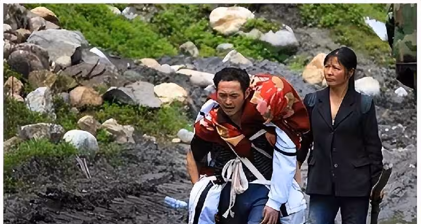 程祥林背著兒子,穿過崩塌的山路,跨過湍急的溪流,甚至在泥石流中艱難跋涉。