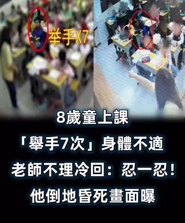 8歲童上課「舉手7次」身體不適 老師不理冷回:忍一忍!他倒地昏死畫面曝。