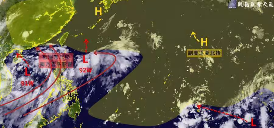「觀氣象看天氣」指出,92W位在菲律賓東方,未來幾天隨低壓帶北移,會順著往北方移動,向北走的過程中,使台灣附近風向轉為偏西南風,使得台灣西南部、東南部水汽有增加的趨勢,2至3天後,可能來到「琉球—那霸」附近。