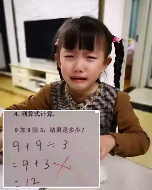 我女兒哪錯了!?國小三年級數學題:「9+9÷3=12」被老師狠狠打叉!家長質問老師「反被打臉」:好好審題