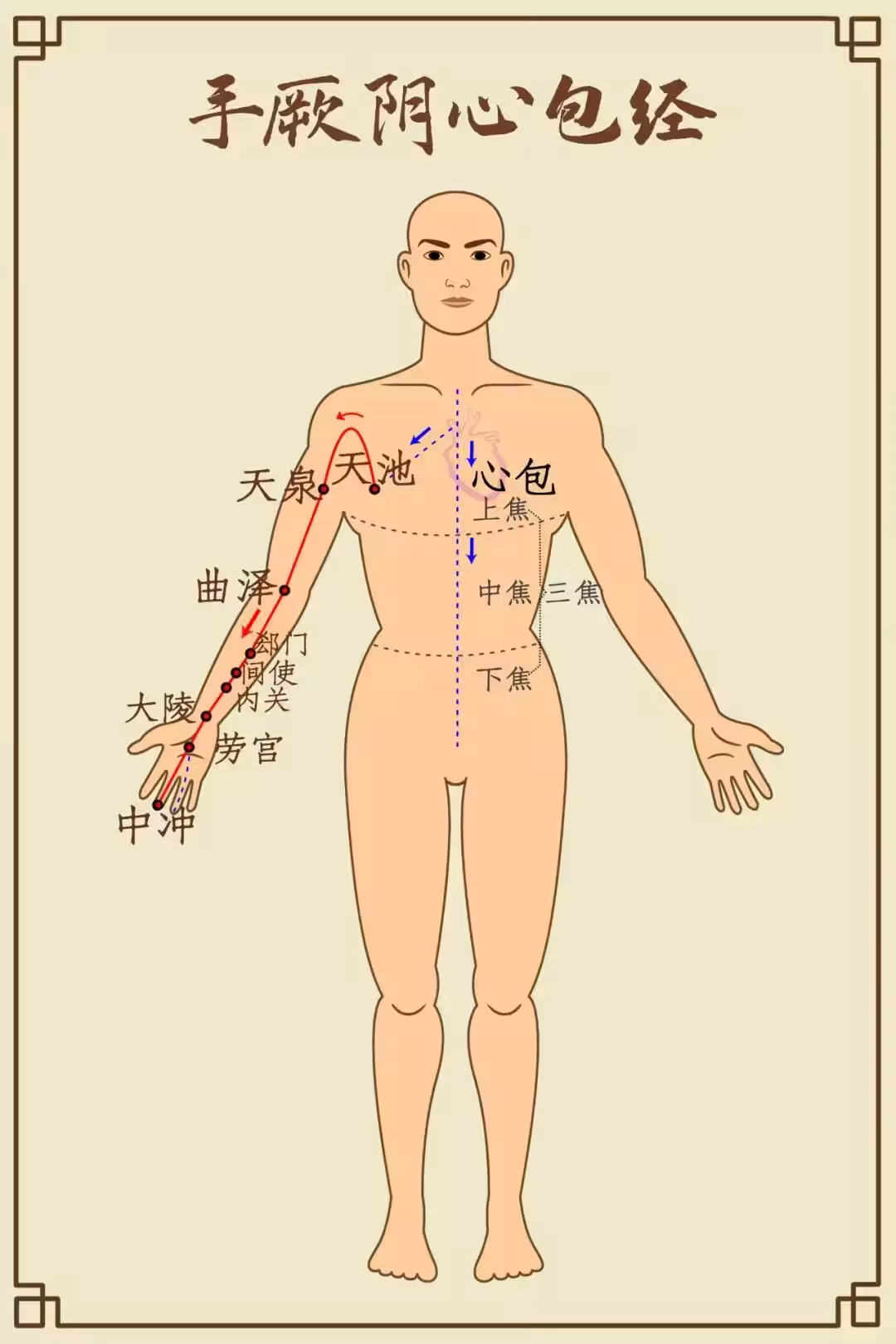 怎麼解決這個問題呢?只要每天拿大拇指按揉心包經就行了。把胳臂往前伸平,從腋下到中指的這條直線就是心包經。
