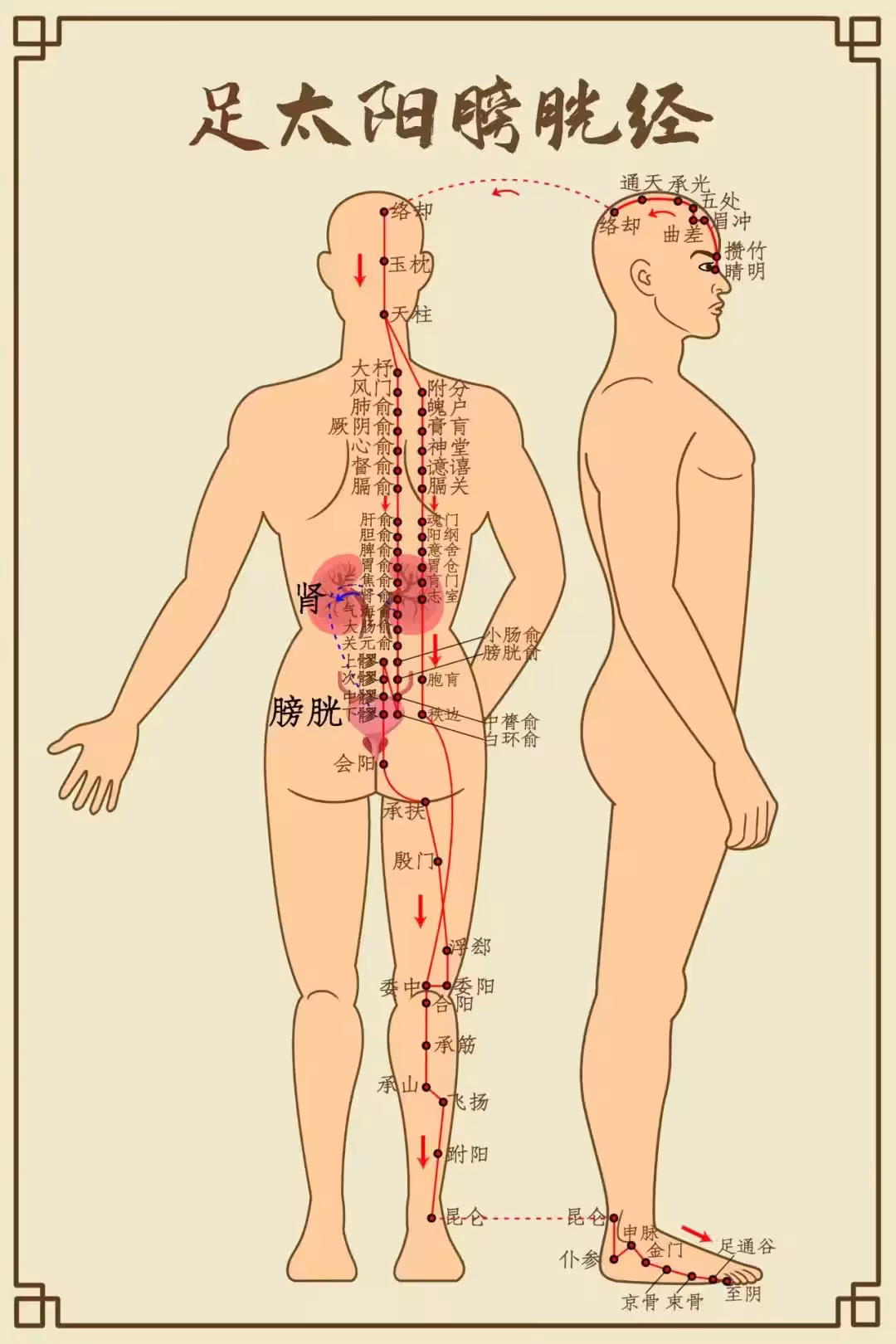 膀胱經通常的問題就是人體的風寒易堆積在那裡。因為它是人體抵禦外寒的一個柵欄。