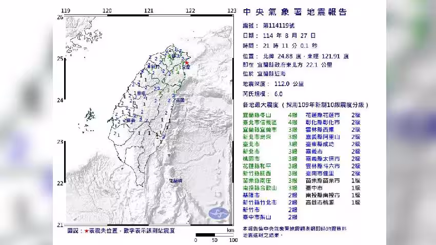 中央氣象署指出,震央位於北緯24.88度,東經121.91度即在宜蘭縣政府東北方 22.1 公里 ,位於宜蘭縣近海,地震深度112公里,芮氏規模6.0。