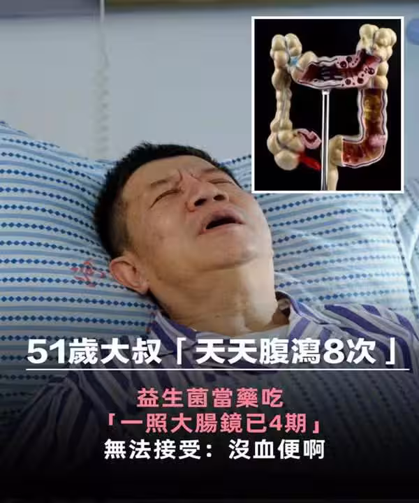 51歲大叔「天天腹瀉八次」以為腸躁症「一照大腸鏡已四期」益生菌當藥吃,無法接受:沒血便啊。