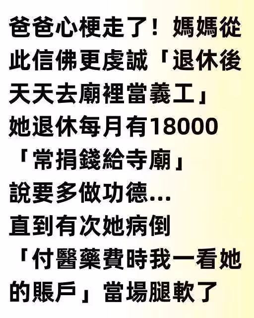 爸爸心梗走了!媽媽從此信佛更虔誠「退休後天天去廟裡當義工」,她退休每月有18000「常捐錢給寺廟」說要多做功德… 直到有次她病倒「付醫藥費時我一看她的帳戶」 當場腿軟了!