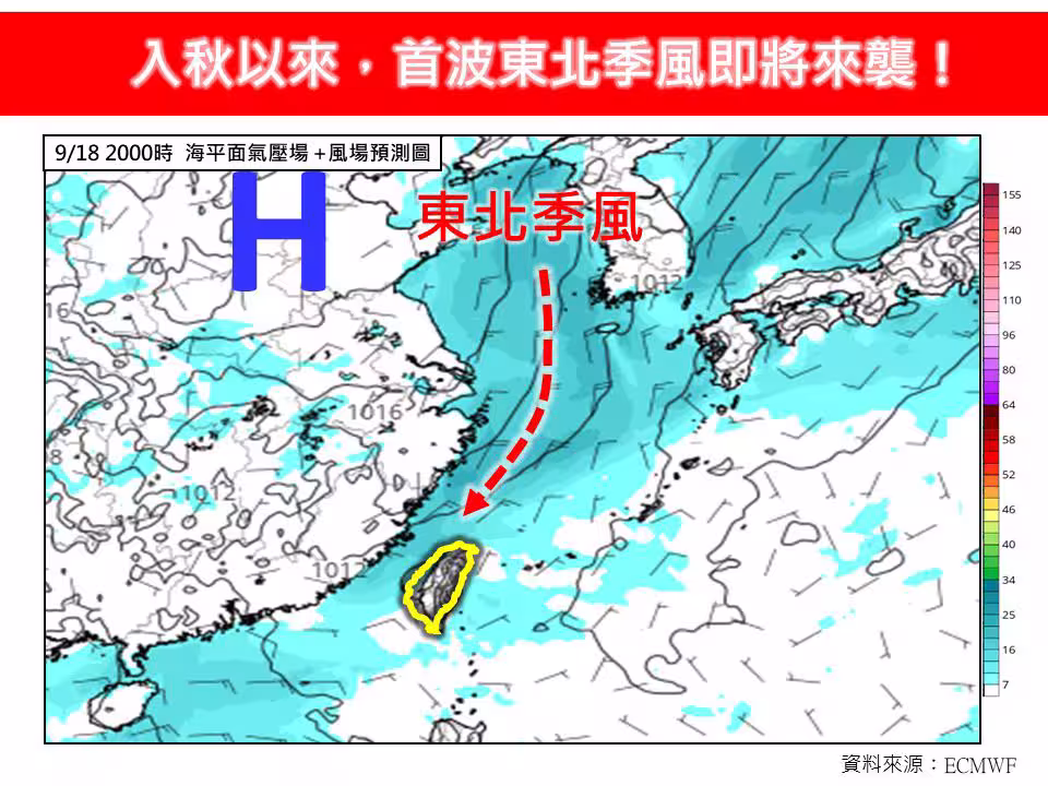 屆時迎風面的北部、東北部將轉為多雲短暫陣雨及局部強陣風的天氣,氣溫至少會降2至4度,後續秋天的味道也將愈來愈濃。氣象署則對此表示,台灣周邊未來一周都沒有熱帶擾動或颱風生成跡象,確實有可能會迎來首波東北季風,不過因時間尚久,還需再觀察。