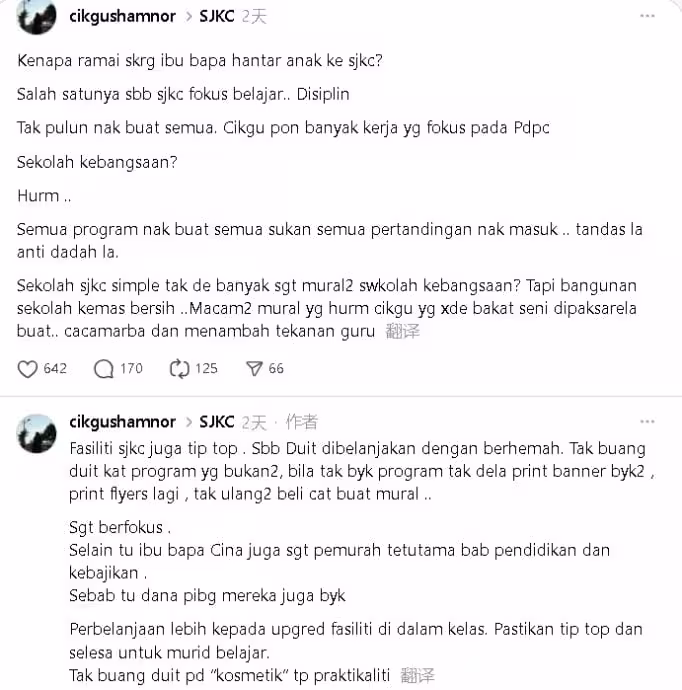 (八打靈再也14日訊)一名巫裔教師在社交媒體稱讚華小諸多優點,包括專注課業學習、提升教學設施、經費支出謹慎,同時犀利點評國小壁畫泛濫、印橫幅「燒錢」浪費資源等,有管理維護不當之責,直言兩者的差距是如今更多父母選擇華小的原因之一!