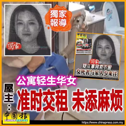 (吉隆坡21日訊/獨家報導)行動黨無拉港特別行動隊隊長「山雞哥」李凱鳴澄清,華裔女子公寓廁所上吊事件,屋主宣稱死者並未欠下房租,且誇讚死者生前人見人愛,從未添任何人的麻煩,是個乖巧的好女孩。