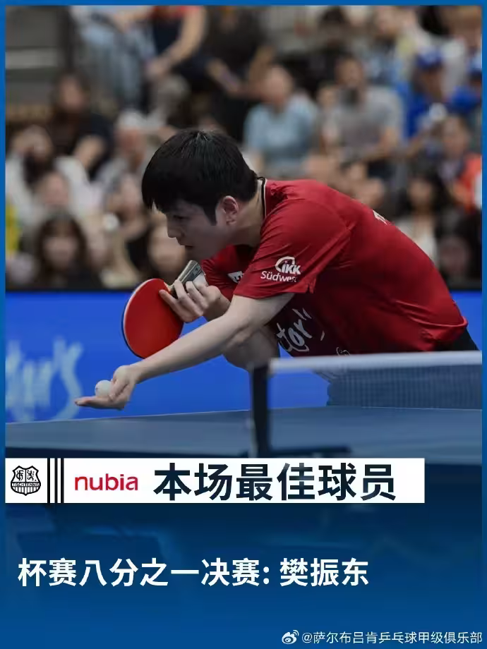 樊振東德國杯八分之一決賽獲全場最佳,得票率74%