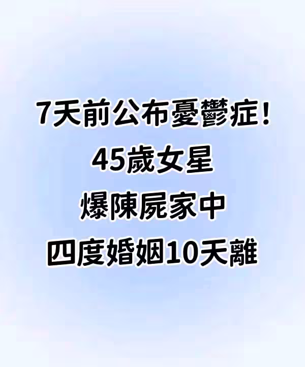 7天前公布憂鬱症!「女星爆陳屍家中」四度婚姻10天離!