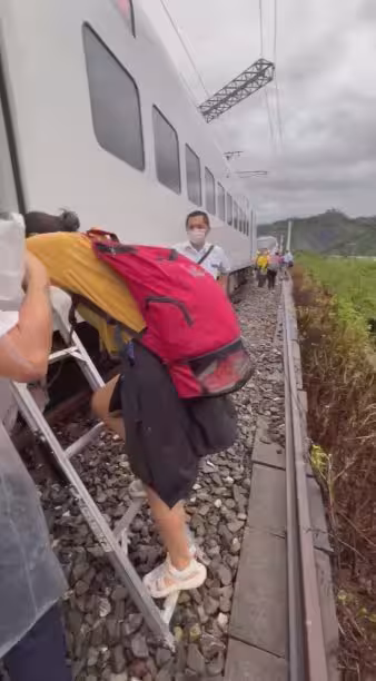 台鐵啟動列車接駁,旅客從火車上搭梯子下車。