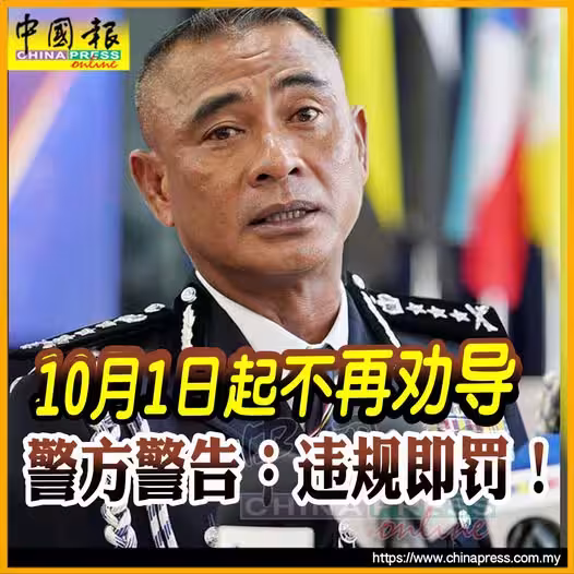(吉隆坡29日訊)10月1日起,所有道路違規者不再收到「勸導通知單」,警方將直接開罰單!