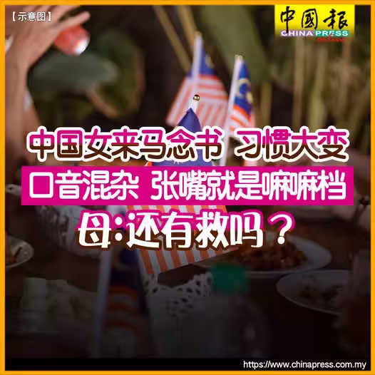 (吉隆坡1日訊)一名中國留學生的母親控訴,其女兒從馬來西亞留學回國後,整個人就跟被「奪舍」一樣,不僅日常行為習慣大變,連說話也開始口音混雜,讓她大感無奈:「好好一個閨女,怎麼去馬來西亞讀個書就變成這樣?」