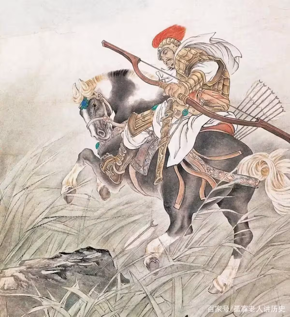 後四歲,廣以衛尉為將軍,出雁門擊匈奴。匈奴兵多,破廣軍,生得廣......暫騰而上胡兒馬,因抱兒鞭馬南馳數十里,得其餘軍。匈奴騎數百追之,廣行取兒弓射殺追騎,以故得脫。