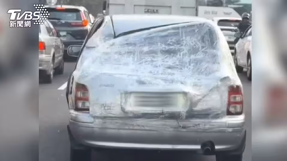 有民眾拍下這輛外觀嚴重受損的小轎車,不僅車門凹凸不平,車頂鈑金也有明顯凹陷,更嚴重的是後擋風玻璃已經完全破損,車主竟然只用膠帶層層包覆,就這樣行駛在下班尖峰時段的繁忙道路上。