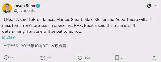 10月3日,湖人官方宣布:詹姆斯(臀部)、斯瑪特(跟腱炎)、克萊伯(股四頭肌)和阿杜-蒂耶羅(膝蓋),將缺席明天和太陽的季前賽。太陽杰倫-格林輕度腿筋拉傷,也不能打。三天之前克萊伯說自己100%恢復健康,如今又傷了。