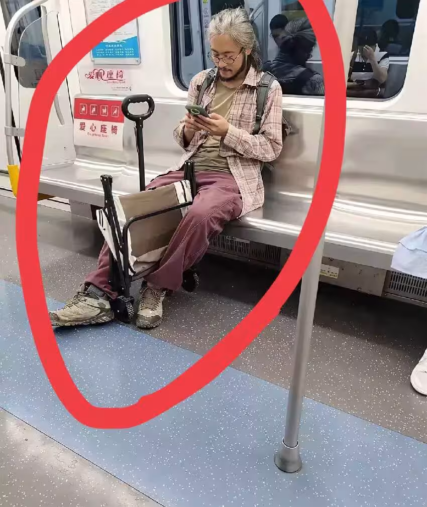 一位「白髮大爺」一上車就吸引了眾人目光——頭髮雪白,長度及肩,隨列車晃動輕輕飄起;上身是 oversize 白 T,下身黑色束口運動褲,腳踩一雙限量帆布鞋,手裡握著最新款摺疊屏手機,正低頭刷短視訊,嘴角偶爾上揚。