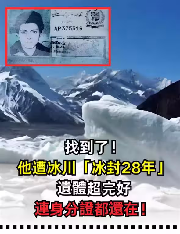 巴基斯坦一名男子在山區失蹤,時隔28年終於尋獲,原來他的遺體一直以來都受困冰川里,直到冰川融化才被找到,全身完好無損,不僅衣服沒有割破,就連身份證都還在口袋裡。