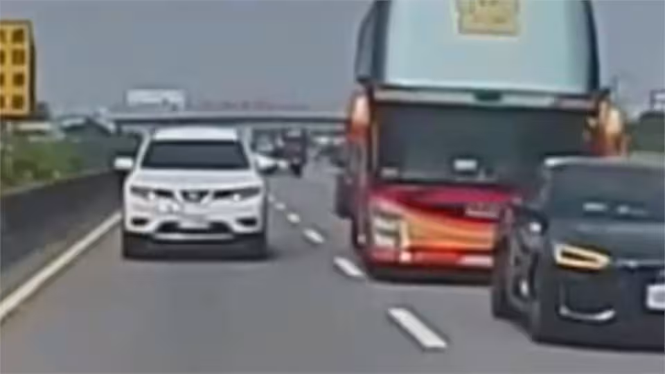 有駕駛開遊覽車上國道,卻因為沒注意車前狀況,一連從後方二次追撞同一部小客車,把小客車車尾撞到凹陷變形,駕駛只差一點就變成夾心餅乾,驚悚畫面讓人捏把冷汗。