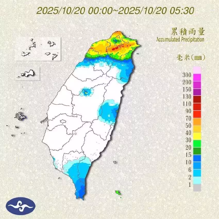 氣象署今晨發布「豪大雨特報」,東北季風及颱風外圍環流影響,今日基隆北海岸、新北市、台北市、桃園市、宜蘭縣有局部大雨或豪雨,新竹、花蓮、南投山區及蘭嶼、綠島有局部大雨發生的機率,請注意短延時強降雨及強陣風,低洼地區請慎防積淹水,山區請嚴防坍方、落石、土石流及溪水暴漲。