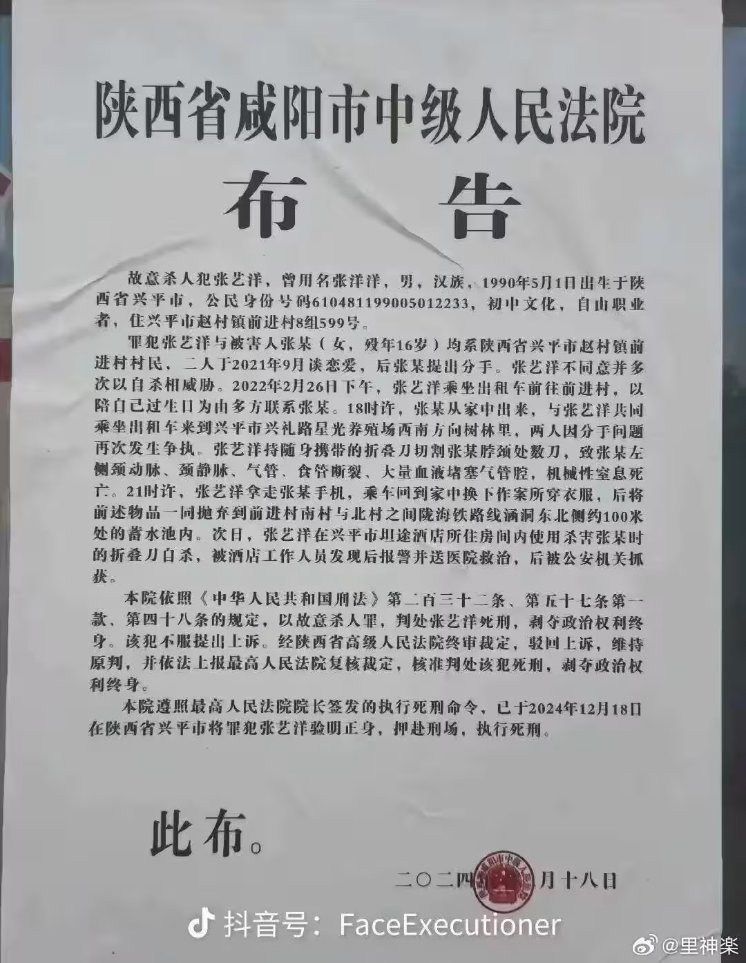 中國18線藝人張藝洋因感情糾紛,於2022年2月26日在陝西省興平市偏遠樹林殘忍殺害年僅16歲的女友張姓少女,後來被法院依故意殺人罪判處死刑,並於2024年12月18日依法執行槍決,成為中國娛樂圈首位被判處死刑並執行的藝人。