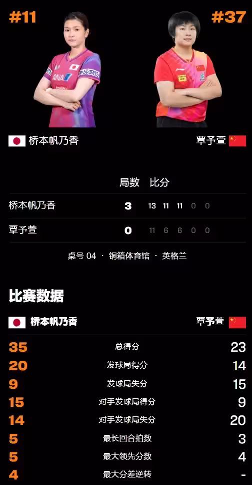 而在以上17場對決,覃予萱就和橋本帆乃香打了3場,結果輸得非常慘,其中2次是0-3落敗,最近1次則是0-4崩盤,如今再次相遇依舊,壓力之大可想而知。