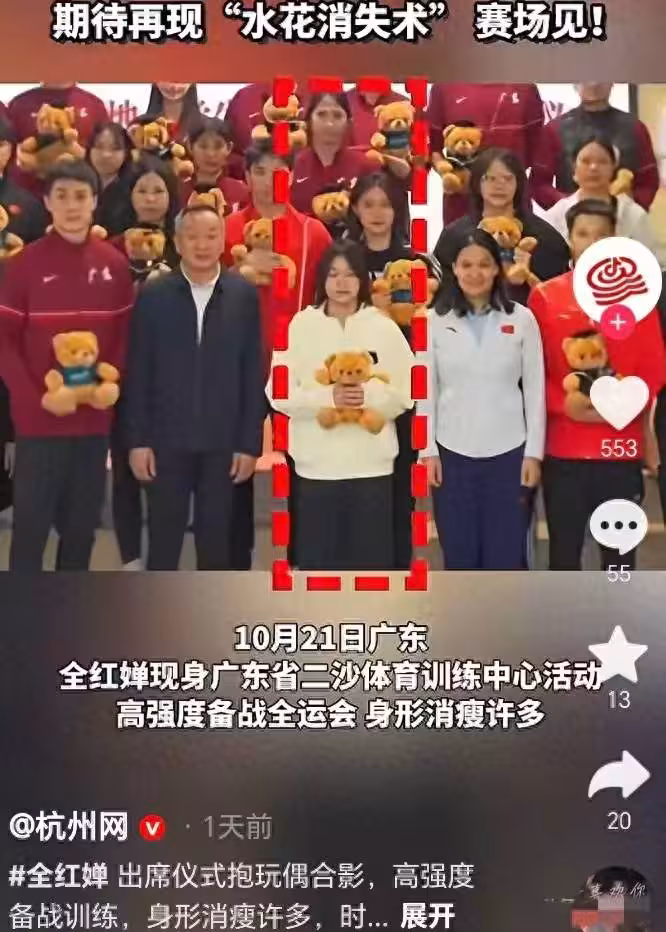 全紅嬋在剛宣布備戰全運會的一周後,就出現在了掛牌儀式上,手裡抱著毛絨玩偶。雖然在人群中她並不顯眼,但熟悉她的人一眼就能發現她的變化——曾經被評論「發福」的身形已經恢復,肩膀線條和腰腹的輪廓都回到了巔峰狀態,走路時甚至帶著曾經在跳台上那種輕盈的感覺。